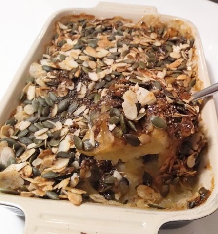 When the apple is cooked and drained, transfer to the bottom of an ovenable dish and top with the crumble.