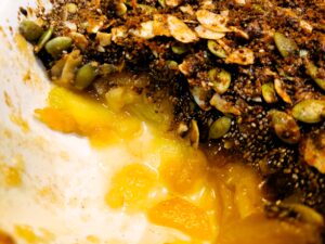 While the apples are cooking, place almond flakes, pumpkin seeds, chia seeds, coconut sugar, melted coconut oil, and cinnamon into a bowl and mix.