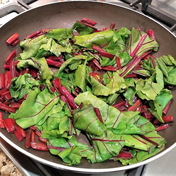 Top and tail the beetroot, wash stalks and leaves, then fry in garlic oil for 5 minutes until stalks are soft and leaves have wilted.