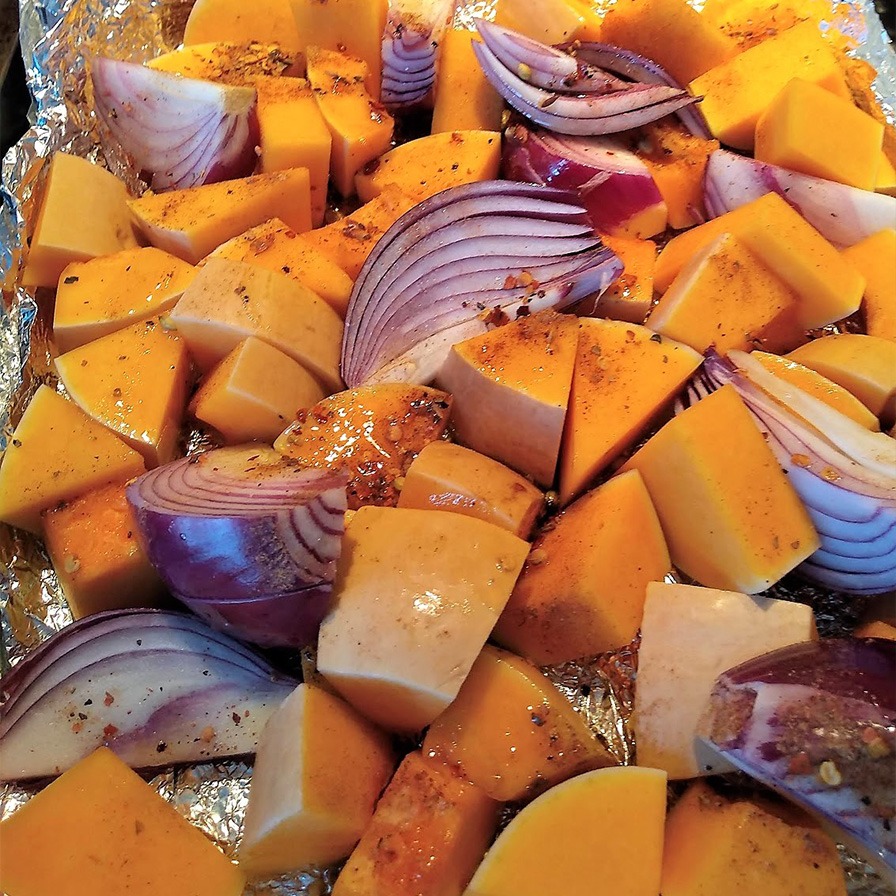 Mix the butternut cubes and red onions in a bowl with 1 tbsp of olive oil and 2 tsp of ras el hanout. Roast in the oven 180C/ Gas 5 for 40-45 mins until crispy and golden.