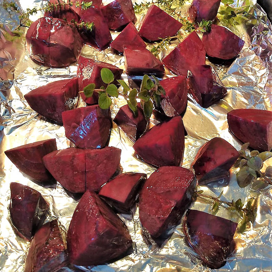 Peel the beetroot ( with disposable gloves) and cut into quarters. Place in a lined baking tray and sprinkle with olive oil, salt, pepper, fresh thyme and oregano.