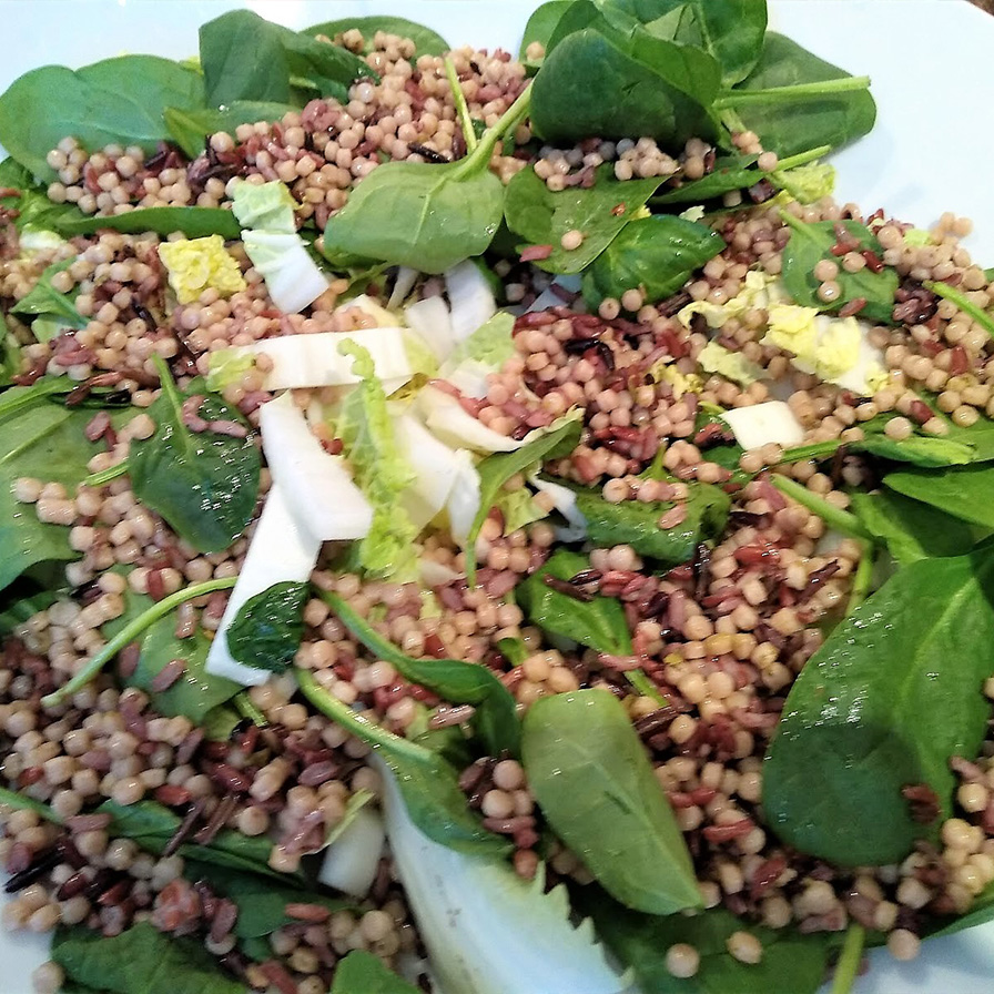 Cook the Israeli couscous and red rice according to pack instructions, allow to cool and mix together. Sprinkle over the leaves.