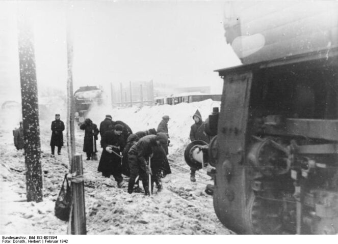 Minsk, Juden müssen Schnee räumen auf dem Bahnhof ADN-ZB/Donath II. Weltkrieg 1939- 1945 Judenverfolgung durch die deutschen faschistischen Besatzungstruppen in der Sowjetunion (Beloruss. SSR) Jüdische Bürger von Minsk beimSchneeräumen auf dem Bahnhof. Aufn. Februar 1942 6291-428 [Scherl Bilderdienst]