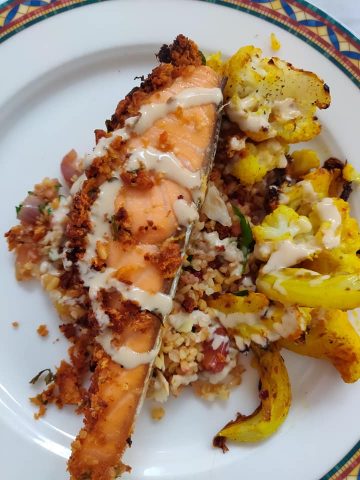 Serve the salmon on a bed of bulgur wheat with the roast cauliflower.
