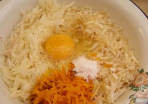 Mix potatoes, celery, carrots. Add egg, salt and black pepper. Mix.