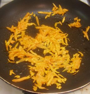Heat 1/2 tablespoons of vegetable oil in a frying pan. Fry the carrots over medium heat, stirring occasionally, until it becomes soft (7-10 minutes)