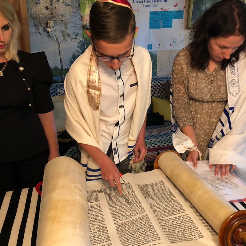 As June came to a close, it was decided that the bar mitzvah would indeed take place in the community centre in Slutsk, with a small group in attendance. Invitations were created by one of the UK Youth for Youth members to be shared online in Russian and English, and on July 16th Pavel did indeed read from the Torah in the tiny basement Jewish community centre in Slutsk. Members of the Polotsk Jewish community made the long journey across the country. Our team travelled from Minsk to coordinate the proceedings. Many people joined online from Ukraine, the UK and the USA and together we witnessed the first bar mitzvah in Slutsk for 25 years.