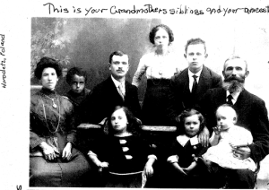 Betty’s family in Harodetz, Poland before Migration. First Row- Florence, Betty, Syd. Second Row- Mother, Abe, Harry, Pearl, Sam, Father