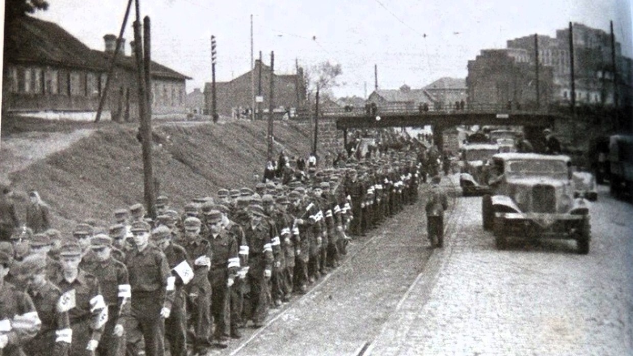 Luftwaffe SPS auxiliaries pass under the Western Bridge. The Government House is visible on the right.
