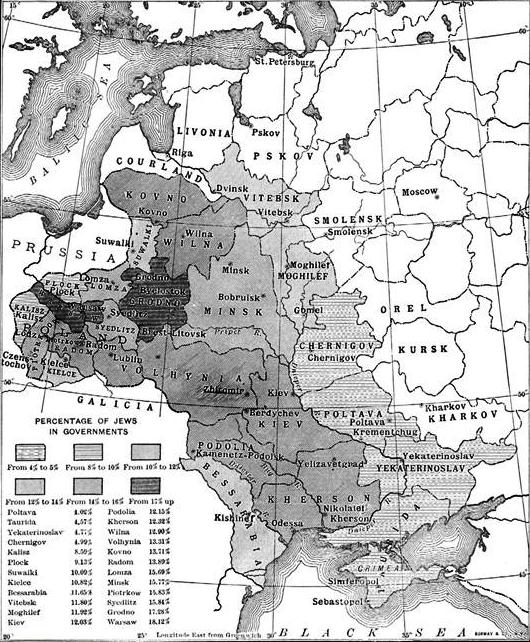 *Map showing the percentage of Jews in the Pale of Settlement and Congress Poland, The Jewish Encyclopedia (1905)