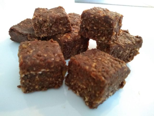 Line a tray with baking paper and press the mixture into the tray. Refrigerate for a couple of hours and then cut into cubes once the brownies are solid to the touch.